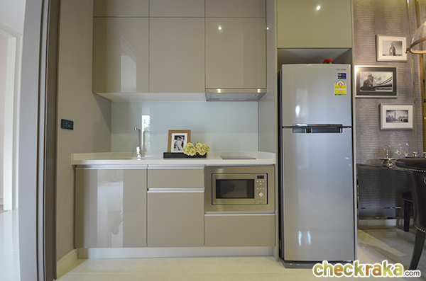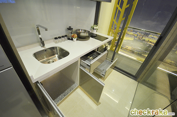 มาพร้อมกับซิงค์ล้างจาน ตู้และลิ้นชักเก็บของ เตาไฟฟ้า และไมโครเวฟ