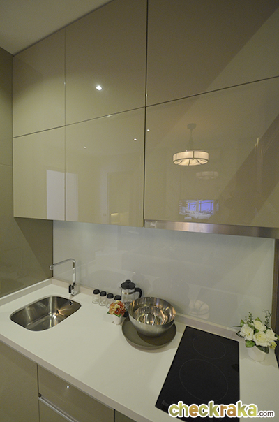เซ็ตเคาน์เตอร์ครัวนี้ทางโครงการให้ทั้งเซ็ตเลยค่ะ โดยพื้นผิวจะเป็นหินสังเคราะห์สวยและง่ายต่อการทำความสะอาด