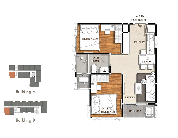 ห้องแบบ 2 ห้องนอน 2 ห้องน้ำ :