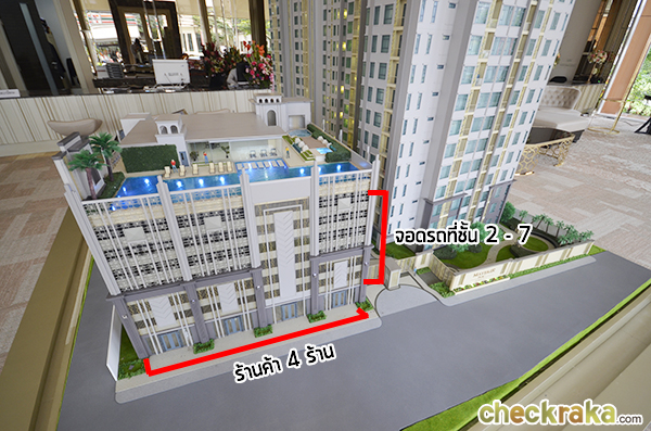 อาคารจะมี 3 อาคารด้วยกัน โดยด้านหน้าสุดจะเป็นอาคารจอดรถค่ะ ด้านล่างจะเป็นร้านค้าทั้งหมด 4 ร้าน