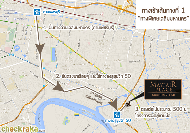 - ทางเข้าโครงการเส้นทางที่ 1 (ทางพิเศษเฉลิมมหานคร - สุขุมวิท 50)