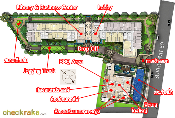 ตัวที่ตั้งโครงการเข้าไปด้านในจาก BTS อ่อนนุช ประมาณ 600 เมตร มีจำนวน 2 อาคาร และอาคารจอดรถ 1 อาคาร มีจำนวนห้องพักอาศัยทั้งหมด 353 ยูนิต โดยทั้ง 2 อาคาร หันหน้าไปทางทิศตะวันออกเฉียงใต้ ที่จะเป็นซอยสุขุมวิท 50 แต่ห้องส่วนใหญ่จะหันหน้าไปทางทิศตะวันตกเฉียงใต้และตะวันออกเฉียงเหนือค่ะ การออกแบบเน้นความโมเดิร์นและความหรูหรา ซึ่ง Master Plan และ Floor Plan จะหน้าตาเป็นอย่างไรนั้นไปชมกันค่ะ