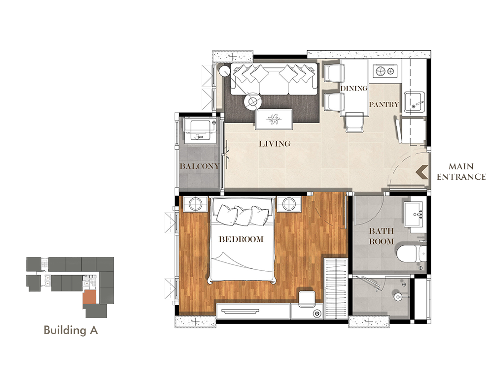 ภาพห้องตัวอย่างแบบ 1 ห้องนอน 1 ห้องน้ำ ขนาด 35 ตร.ม.