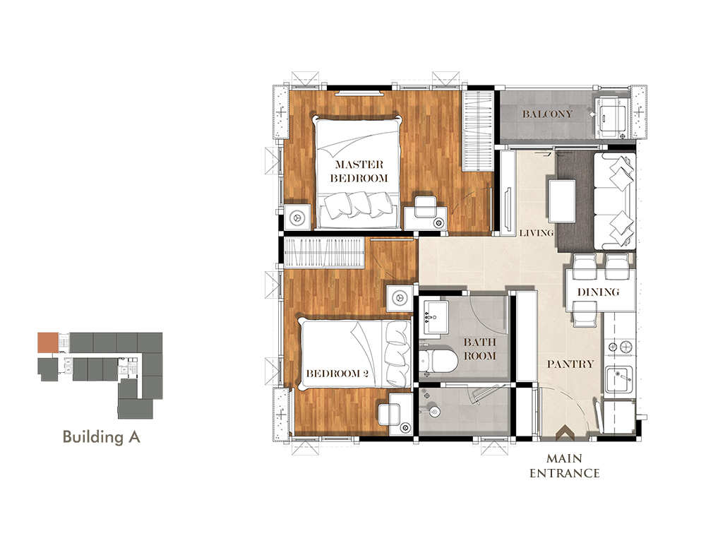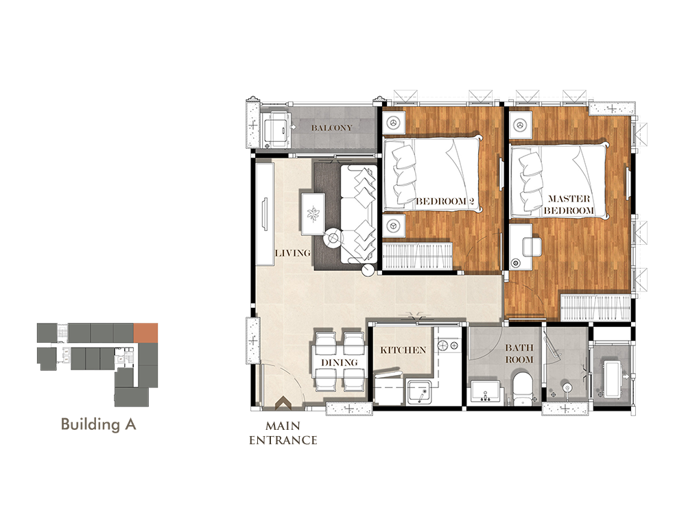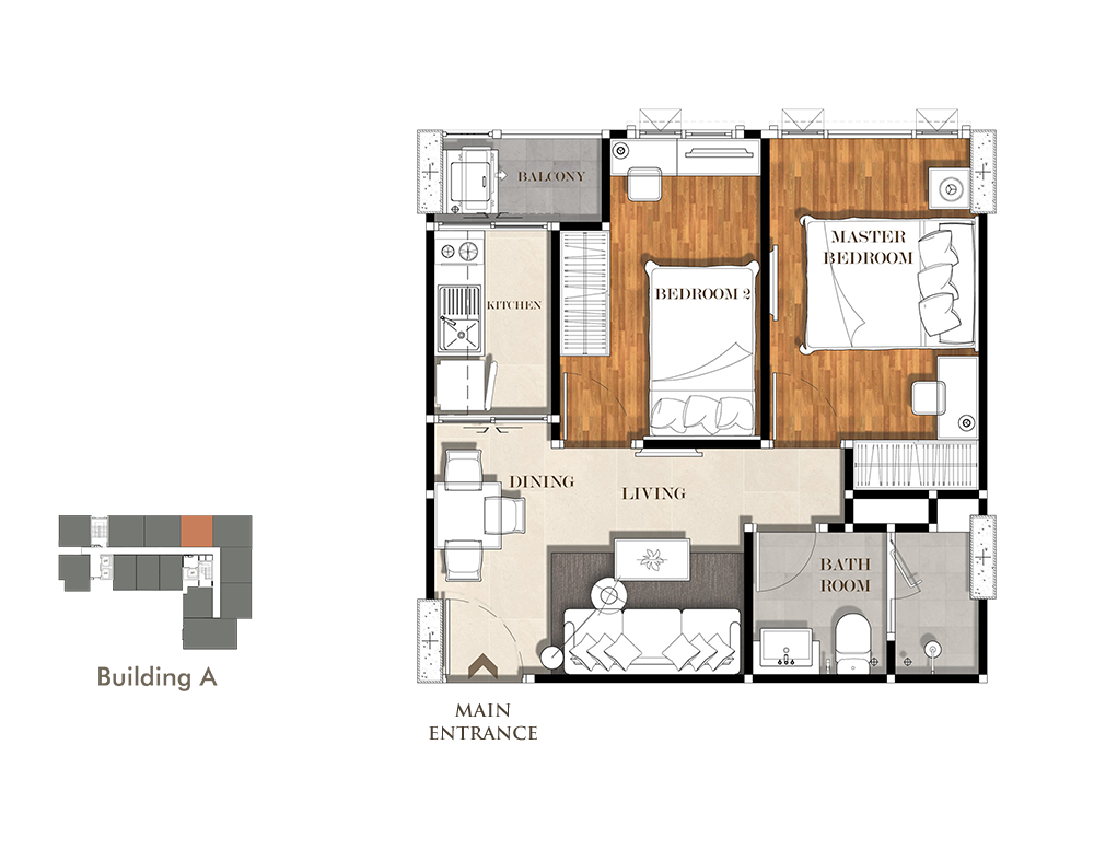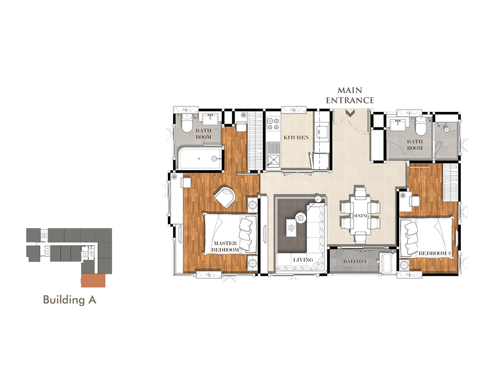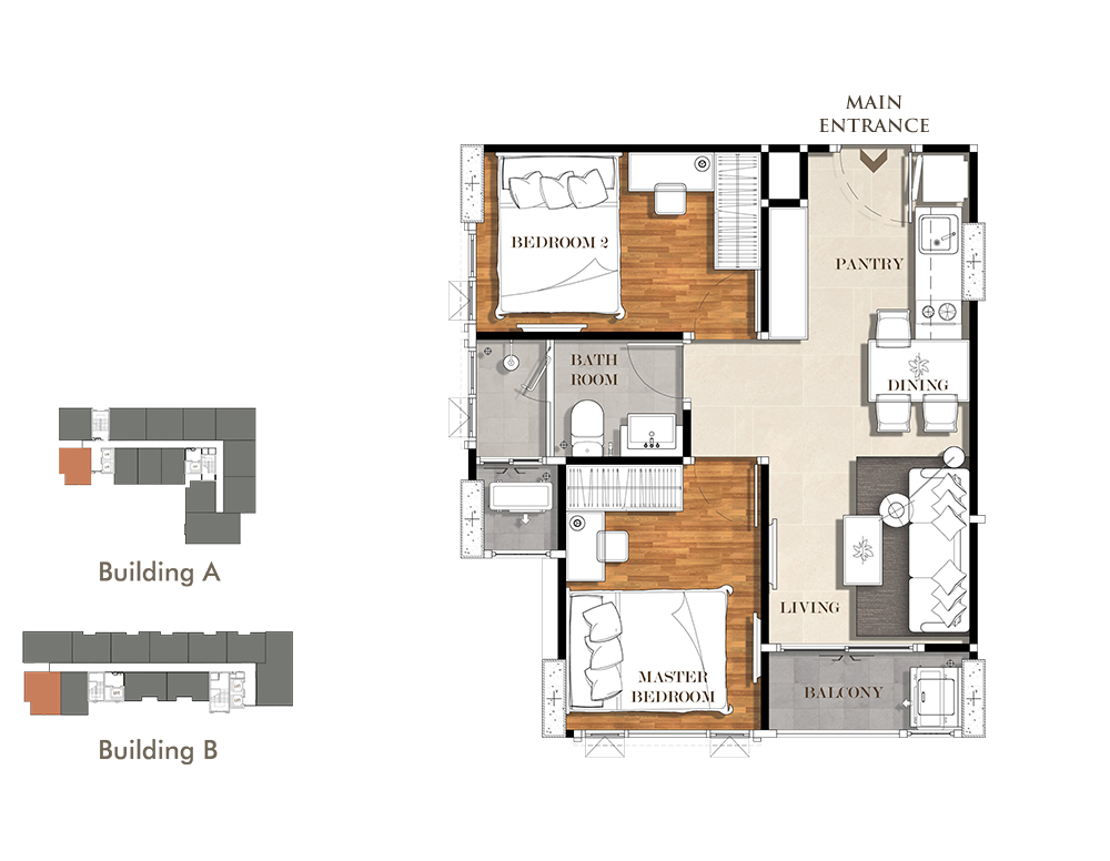 ห้องแบบ 2 ห้องนอน 2 ห้องน้ำ :