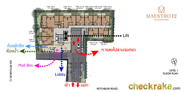 - การเดินทางเข้าออกโครงการ - สำหรับการเดินทางเข้าออกโครงการนั้น ถือว่าสะดวกทีเดียวค่ะ เพราะสามารถเดินทางได้ทั้งรถไฟฟ้า และรถยนต์ สำหรับผู้ที่ต้องการหลีกเลี่ยงรถติดบนถนนก็สามารถใช้บริการรถไฟฟ้า BTS ได้ โดยลงที่สถานีราชเทวี สามารถออกได้ทั้ง 2 ทางออกคือ ทางออกที่ 1 และทางออกที่ 3 สำหรับทางออกที่ 1 ผ่านซอยพญานาคเพื่อไปเชื่อมต่อกับซอยเพชรบุรี 12 มีระยะทางโดยประมาณในการเดินที่ 450 เมตร (วัดจาก Google Map) และทางออกที่ 3 เดินไปตามถนนเพชรบุรี ไปจนถึงซอยเพชรบุรี 12 มีระยะทางโดยประมาณในการเดินทางที่ 290 เมตร หรือใครจะใช้บริการวินมอเตอร์ไซค์ที่มีให้บริการตรงบันไดรถไฟฟ้าก็ได้เช่นกันค่ะ สำหรับการเดินทางด้วยรถยนต์นั้นก็สะดวกเช่นกันค่ะ สามารถมาจากทั้งทางถนนบรรทัดทอง ถนนพญาไท หรือถนนราชดำริ เพื่อมาเชื่อมต่อกับถนนเพชรบุรีตัดใหม่ ถ้าหากมาจากทางถนนพญาไท หรือถนนราชดำริ สามารถตรงมาทางถนนเพชรบุรี เลี้ยวซ้ายเข้าโครงการบริเวณซอยเพชรบุรี 12 ได้เลย ถ้าหากมาจากทางถนนบรรทัดทอง ตรงไปกลับรถใต้สะพานก่อนแล้วเลี้ยวซ้ายเข้าโครงการได้เช่นกันค่ะ