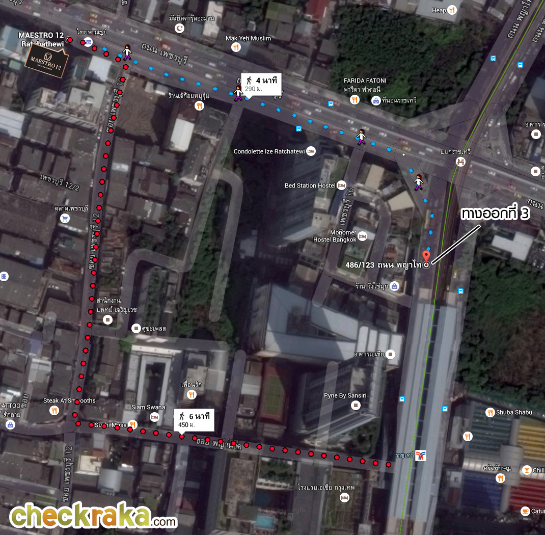 การเดินทางจากรถไฟฟ้า BTS สถานีราชเทวี สามารถออกได้ 2 ทางออก คือ ทางออกที่ 1 และทางออกที่ 3 ค่ะ ทางออกที่ 1 นั้นสามารถเดินเข้าจากซอยพญานาคเพื่อมาเชื่อมต่อกับซอยเพชรบุรี 12 ได้ มีระยะทางโดยประมาณวัดจาก Google Map ได้ 450 เมตร สำหรับทางออกที่ 3 จะใช้เส้นทางถนนเพชรบุรี เดินมายังซอยเพชรบุรี 12 ได้ในระยะทางที่ใกล้กว่าเพียง 290 เมตรเท่านั้นค่ะ สำหรับเส้นทางที่เราจะพาไปชม เป็นเส้นทางจากทางออกที่ 3 ค่ะ
