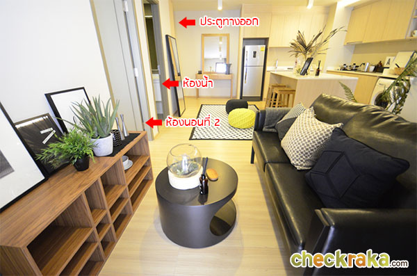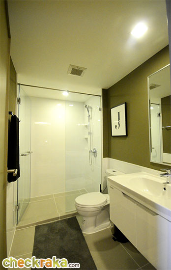 - รูปแบบห้องและวัสดุ - ห้องพักอาศัยของที่นี่มีตั้งแต่ขนาด 26.5 - 99.5 ตารางเมตร ประกอบไปด้วยห้องแบบ 1 - 3 ห้องนอน เป็นการแบ่ง Type ห้องที่ค่อนกว้าง และหลากหลายอยู่พอสมควร ซึ่งก็เป็นข้อดีสำหรับการเลือกซื้อให้ตรงกับความต้องการของแต่ละครอบครัว ทางด้าน Lay out ห้องพักอาศัยจากห้องตัวอย่างที่เข้าไปสำรวจกันมาเป็นห้องแบบ 2 ห้องนอน ที่คำนึงในเรื่องของการใช้งานเป็นหลักเพราะทางโครงการให้เฟอร์นิเจอร์ ทั้งแบบ Built in และแบบลอยตัว จัดเต็มชนิดที่เรียกได้ว่าไม่ต้องซื้ออะไรเพิ่มอีกเลยค่ะ รวมไปถึงเครื่องใช้ไฟฟ้า และเครื่องปรับอากาศ แบบไม่อั้น จากพื้นถึงเพดานมีความสูงตามมาตรฐานคือ 2.45 เมตร ใช้พื้นลามิเนตหนา 8 มิลลิเมตร และให้สุขภัณฑ์ American Standard ทั้งชุด รวมไปถึง Shower Box ที่รวมมากับเฟอร์นิเจอร์ภายในห้องน้ำ