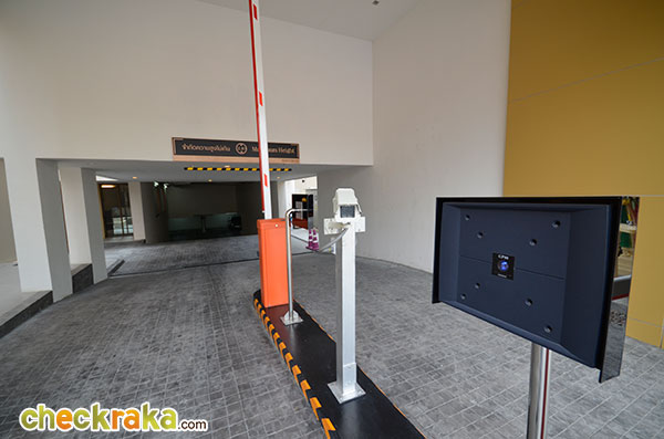 ทางที่จะลงไปลานจอดรถชั้น B1 และ B2 ตรงทางเข้า-ออก เป็นระบบบัตรผ่านมีไม้กระดก