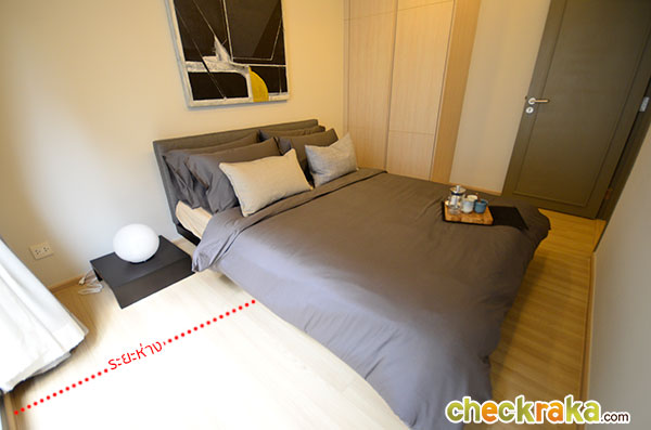 ระหว่างเตียงนอนกับหน้าต่าง ก็ยังมีพื้นที่อยู่พอสมควร ตรงนี้สามารถวางชั้นวางของที่เป็นทรงเตี้ยๆ