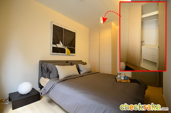 ก่อนที่จะเดินถึงห้องน้ำที่อยู่ภายในห้องนอน ต้องเดินผ่านตู้เสื้อผ้า Built in ที่ให้มาคุ้มถึง 2 ฝั่ง
