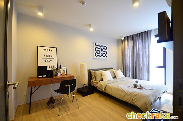 เข้ามาในห้องนอนที่ 1 ทางโครงการตกแต่งด้วยโต๊ะเขียนหนังสือ วางอยู่ข้างเตียงขนาด 5 ฟุต