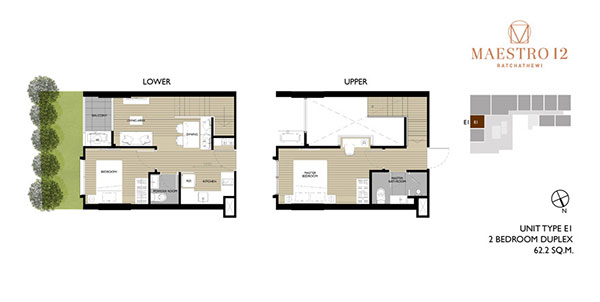 (คลิกเพื่อชมตัวอย่างแปลนห้องขนาดใหญ่) - ห้องแบบ 2 ห้องนอนแบบ Duplex พื้นที่ใช้สอย 59 ตร.ม.