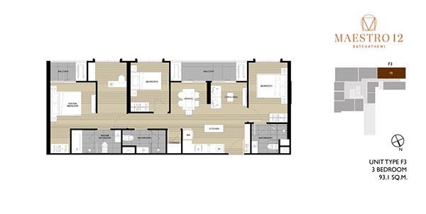 (คลิกเพื่อชมตัวอย่างแปลนห้องขนาดใหญ่) - ห้องแบบ 3 ห้องนอน พื้นที่ใช้สอย 81 - 99.5 ตร.ม.