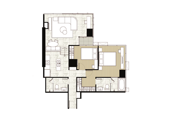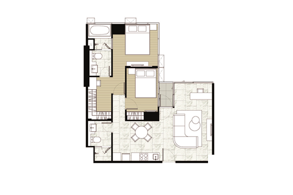 ตัวอย่าง ห้องแบบ 2 ห้องนอน 2 ห้องน้ำ (Vertical Interlocking) - พื้นที่ใช้สอย 86.00-86.50 ตร.ม.
