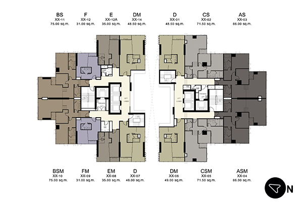 - Typical BS พื้นที่ใช้สอย 75.00 - 76.00 ตร.ม. (คลิกเพื่อชมแปลนห้อง)