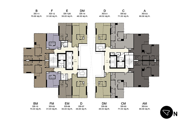 - Typical DM พื้นที่ใช้สอย 48.50 - 49.50 ตร.ม. (คลิกเพื่อชมแปลนห้อง)