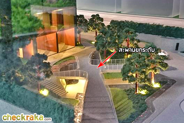 มีสะพานยกระดับเป็นลูกเล่นเดินข้ามไปหน้าทางเข้าอาคาร