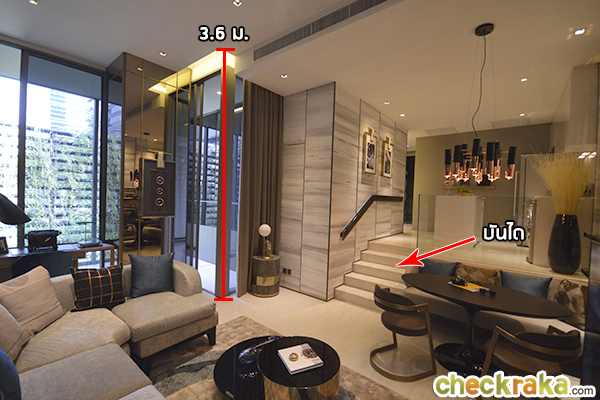 ความสูงจากพื้นถึงเพดาน 3.6 เมตร ใช้บันไดเพื่อแบ่งห้องครัวและห้องรับแขกออกจากกัน (Vertical Interlocking)