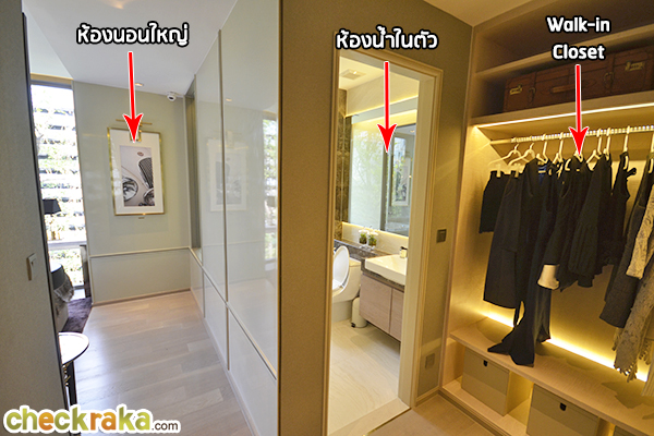 ถัดมาจะเป็นห้องนอนใหญ่ค่ะ ซึ่งจะมีห้องน้ำอีกห้องและมีมุม Walk-in Closet ด้านซ้ายมือ