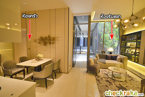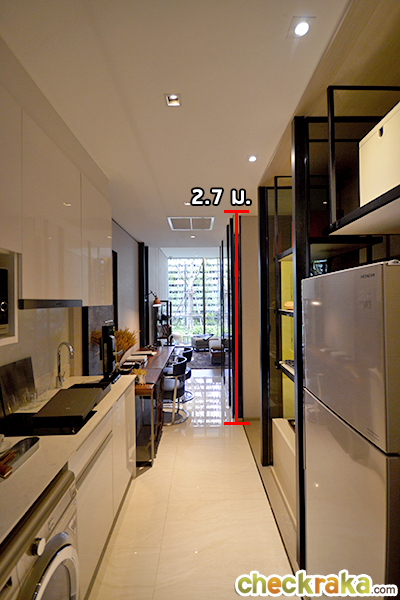 เข้าไปก็จะเจอห้องครัวก่อนเลย เชื่อมต่อไปยังมุมโต๊ะทานข้าว จากพื้นถึงเพดานสูง 2.7 เมตรค่ะ