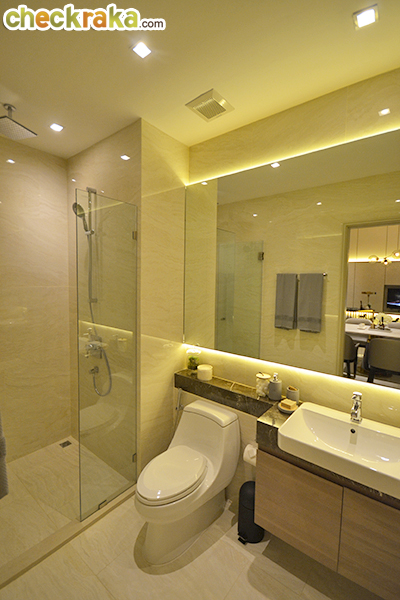ห้องน้ำสุขภัณฑ์จาก Kohler และ Grohe มีฉากกั้นอาบน้ำและจัดเต็มด้วยกระจกบานใหญ่