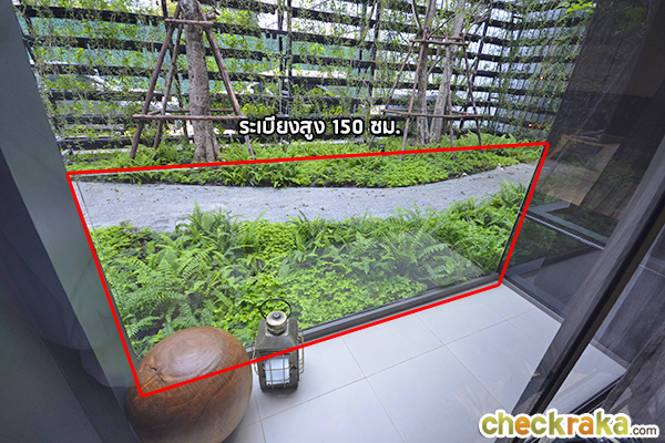 ความสูงของระเบียง 150 เซนติเมตร จะสังเกตว่าโครงสร้างๆ หลายส่วนของห้องจะลดการใช้ผนังปูน