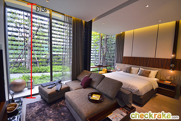 กระจกสูงจรดเพดานช่วยให้ห้องดูโปร่งโล่ง รับแสงจากธรรมชาติได้เต็มที่ ลดการใช้ไฟในห้องได้อีกด้วยค่ะ