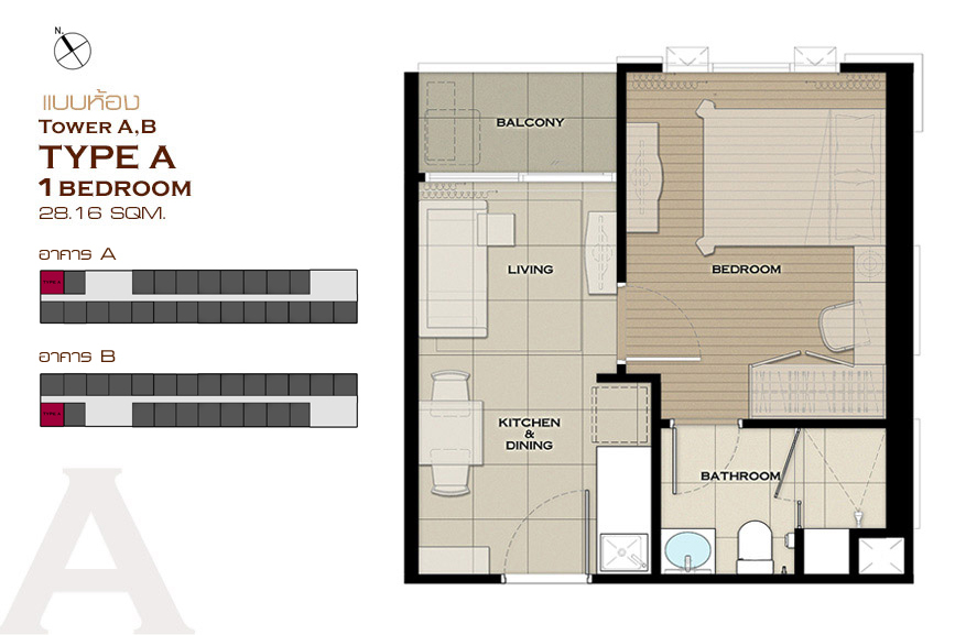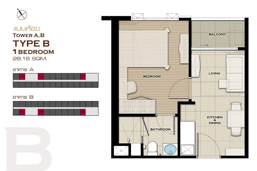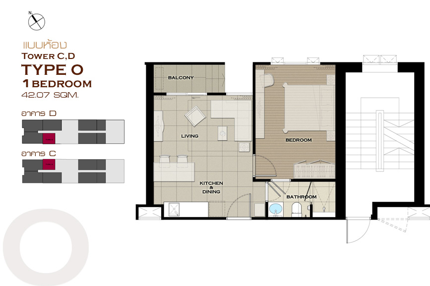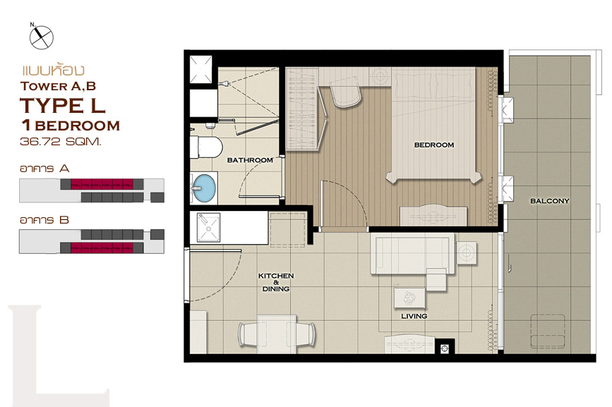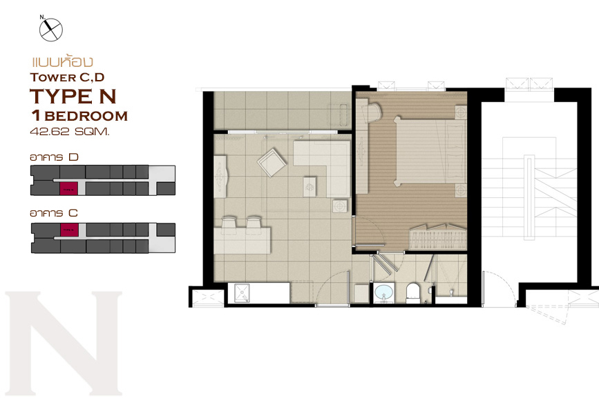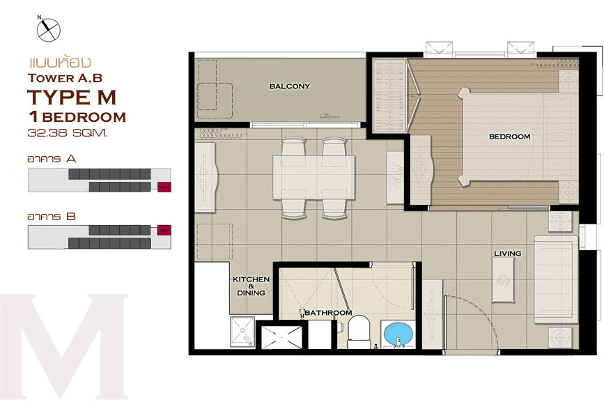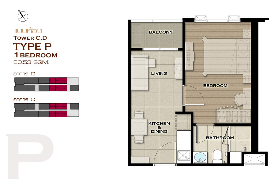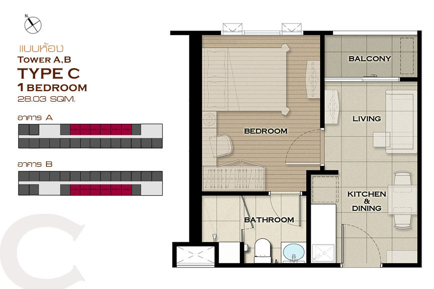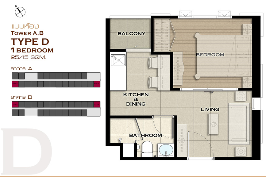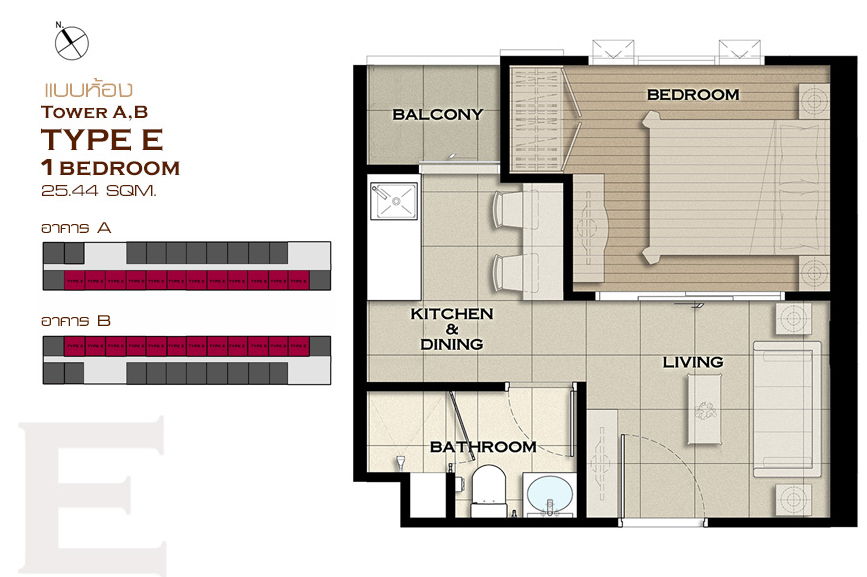 แบบห้อง 1 ห้องนอน ขนาด 25.44 ตร.ม.
