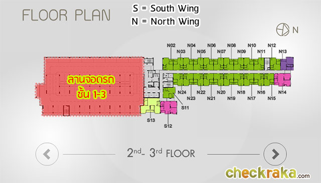 ชั้น 2-3 : จะเป็นส่วนของ ลานจอดรถที่เริ่มตั้งแต่ชั้น 1 และห้องพักอาศัยจำนวน 26 ยูนิต