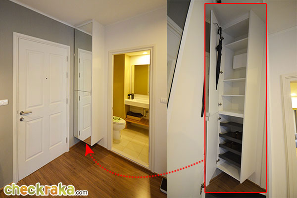 ตู้กระจกที่อยู่ระหว่างประตูห้องกับห้องน้ำคือตู้เก็บของ สามารถเก็บร่ม, เก็บรองเท้า และด้านบนยังเป็นกล่องเบรคเกอร์