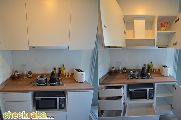 ซ้ายมือเป็นเคาน์เตอร์ครัวแบบ Built-in มีช่องให้วางไมโครเวฟ