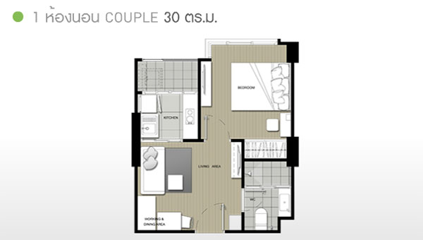1. ห้องแบบ 1 Bedroom Couple พื้นที่ใช้สอย 30 ตร.ม.