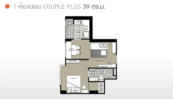2. ห้องแบบ 1 Bedroom Couple Plus พื้นที่ใช้สอย 39 ตร.ม.