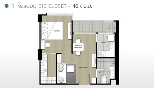 3. ห้องแบบ 1 Bedroom Big Closet พื้นที่ใช้สอย 40 ตร.ม.