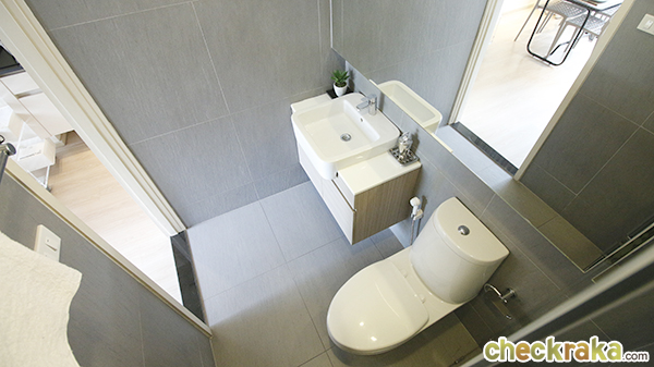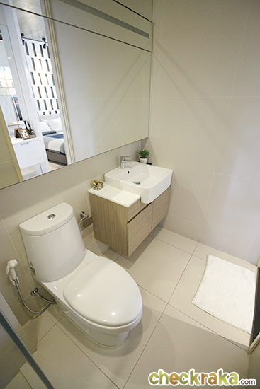 ห้องน้ำมีลักษณะเหมือนกันกับด้านนอกเลยค่ะ มาพร้อมกับอ่างล้างหน้าทรงสี่เหลี่ยมทันสมัย