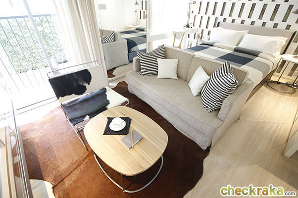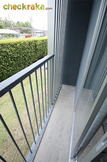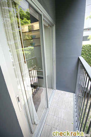 พื้นที่ระเบียงไม่ได้กว้างมากแต่จะเน้นพื้นที่ใช้สอยในห้องมากกว่าค่ะ