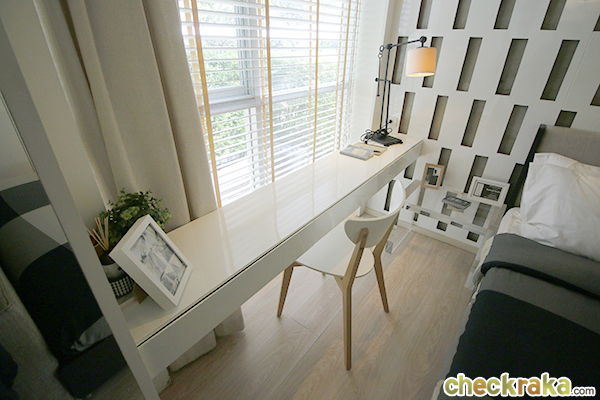 พื้นที่ข้างเตียงตกแต่งเป็นโต๊ะทำงานขนานไปกับกระจกรับแสง ทำให้ประหยัดเนื้อที่