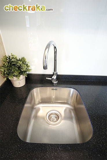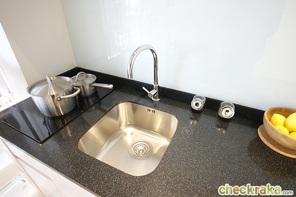 จากภาพซ้ายมือเป็นเคาน์เตอร์ครัวประกอบไปด้วยก๊อก+ซิงค์ล้างจานมีช่องสำหรับวางไมโครเวฟด้านบน