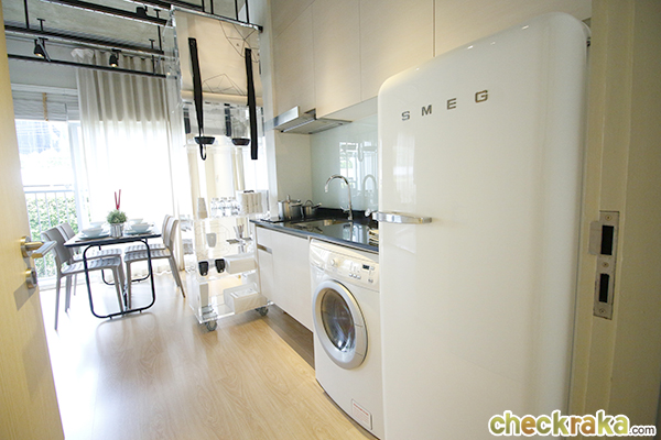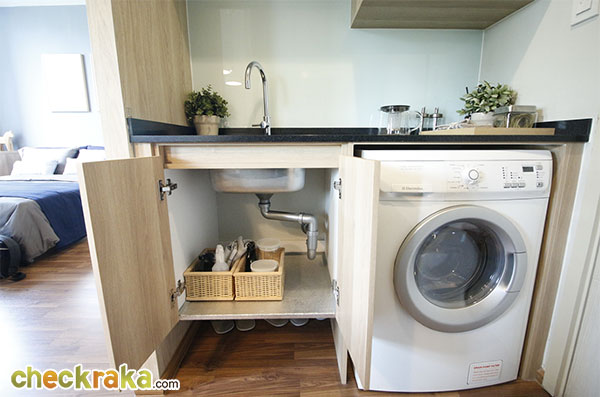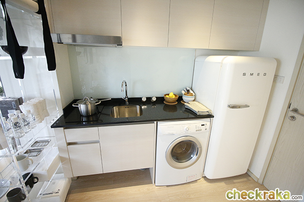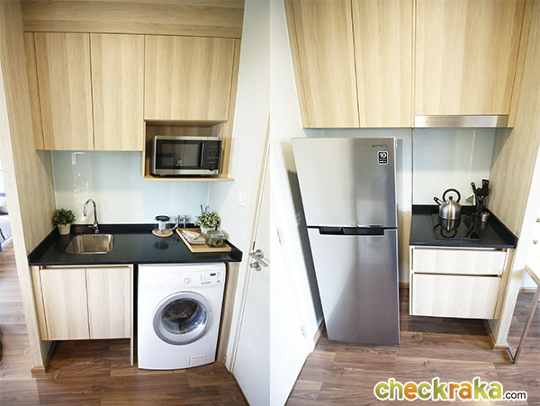 ชุดครัวมีครบทั้งเตาไฟฟ้า เครื่องดูดควัน อ่างล้างจาน และยังสามารถติดตั้งเครื่องซักผ้าแบบฝาหน้า