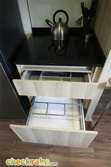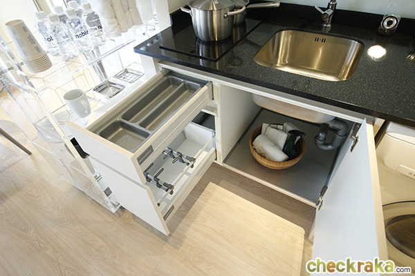 ส่วนด้านล่างจะเป็นลิ้นชักเก็บช้อน ส้อม จาน ชาม ใต้อ่างก็ยังเหลือพื้นที่อีกนิดหน่อย