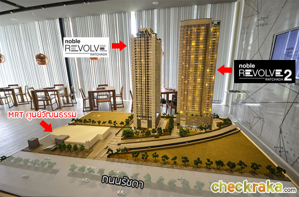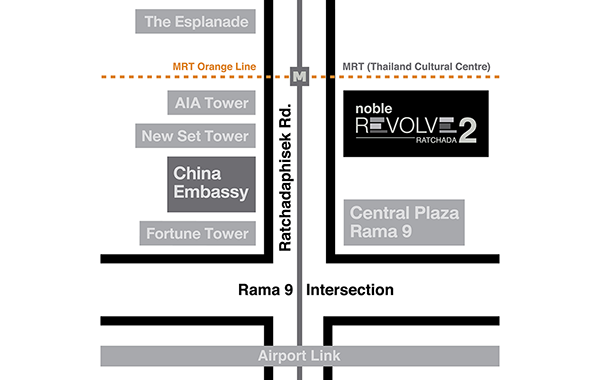 โครงการ โนเบิล รีวอลฟ์ รัชดา 2 (Noble Revolve Ratchada 2) อยู่ติดถนนรัชดาภิเษก แขวงห้วยขวาง เขตห้วยขวาง กรุงเทพมหานคร เดินไม่กี่ก้าวก็ถึงรถไฟฟ้า MRT สถานีศูนย์วัฒนธรรมแห่งประเทศไทย และยังเป็นจุดเชื่อมต่อรถไฟฟ้าสายสีส้มในอนาคตอีกด้วยค่ะ ถนนรัชดาภิเษกและรอบๆ มีสถานที่สำคัญมากมาย อาทิ ศูนย์วัฒนธรรมแห่งประเทศไทย เอสพลานาด เดอะ สตรีท บิ๊กซี รัชดาฯ ฟอร์จูนทาวเวอร์ เซ็นทรัลพระราม 9 ฯลฯ