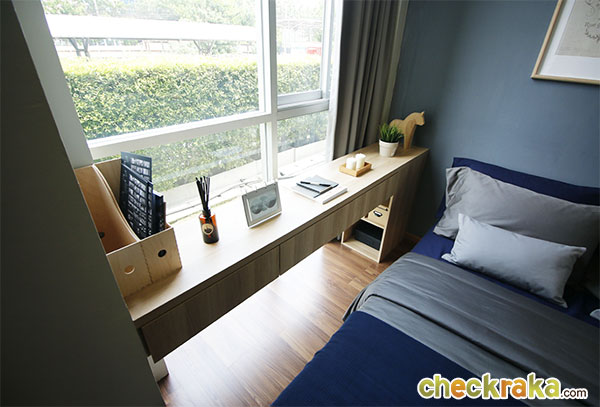 ชั้นวางของไซส์ยาวที่เห็นใกล้กับหน้าต่างภายในห้องนอนทางโครงการ Built-in ให้อยู่ข้างเตียงเป็นได้ทั้ง