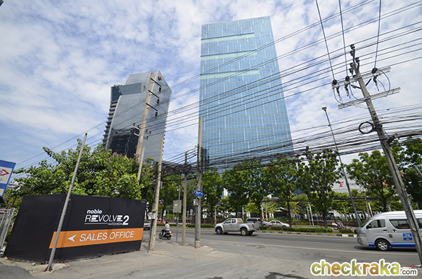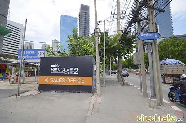 มองจากฝั่งตรงข้ามถนนรัชดา ซ้ายมือคือโครงการรุ่นพี่ Noble Revolve Ratchada และขวามือเป็น Noble Revolve Ratchada 2 ใช้ทางเข้าร่วมกัน (ซอย 6) มีทางเข้า-ออกทางเดียว
