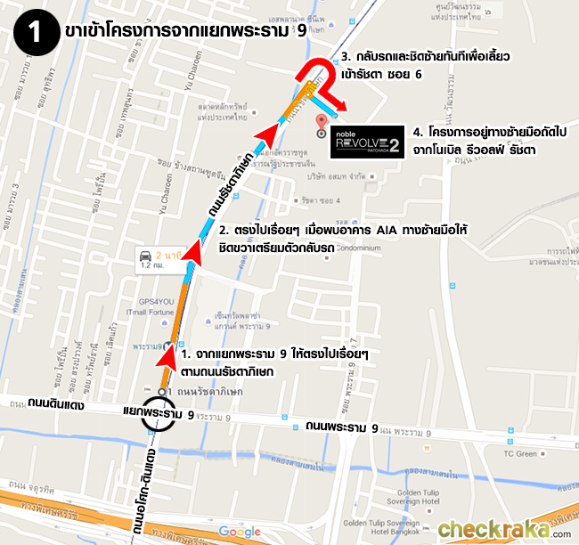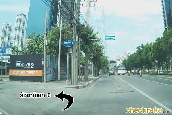 เลี้ยวซ้ายเข้ารัชดาฯ ซอย 6 สำนักงานขายตั้งอยู่บริเวณหน้าโครงการ Noble Revolve Ratchada