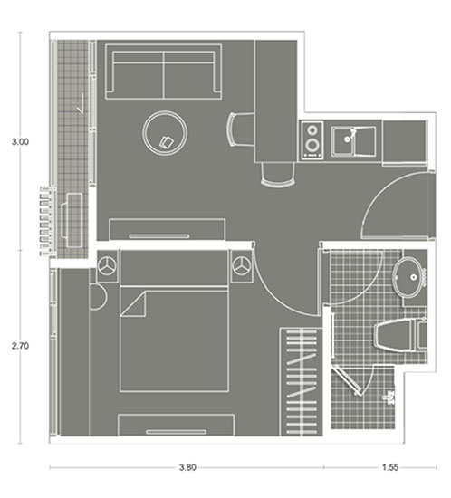 พื้นที่ระเบียงไม่ได้กว้างมากแต่จะเน้นพื้นที่ใช้สอยในห้องมากกว่าค่ะ