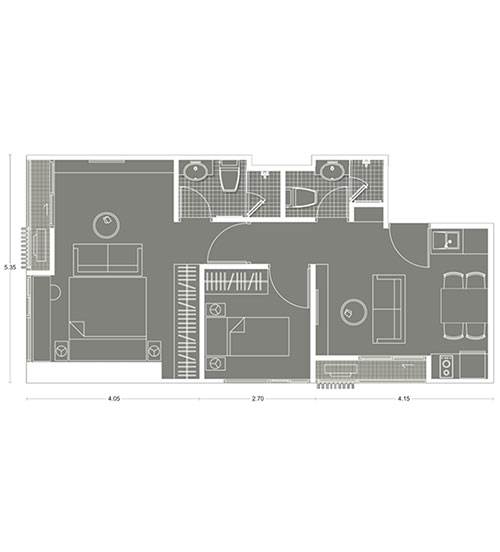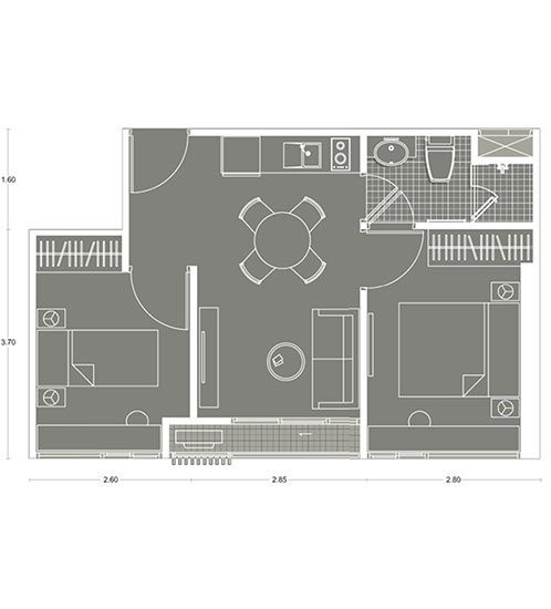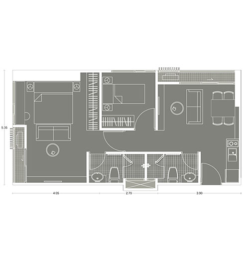 Plan ห้องแบบ 2 ห้องนอน ขนาด 52.77 ตร.ม.