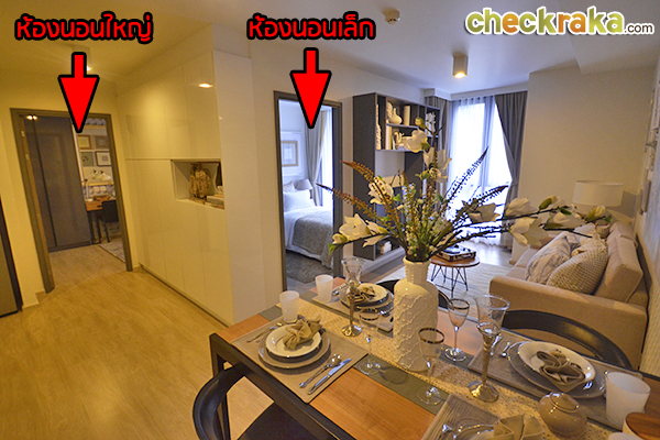 มุมมองจากบริเวณโต๊ะทานข้าวค่ะ ห้องนอนใหญ่จะอยู่โซนใกล้ๆ กับห้องครัว ส่วนห้องนอนเล็กอยู่โซนห้องรับแขก