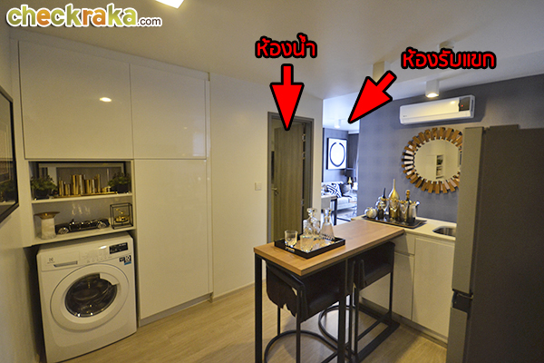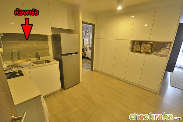 เดินเข้ามาจะเจอห้องครัวด้านขวามือค่ะ สำหรับส่วนด้านหน้า โครงการจะ Built-in ตู้เก็บของ