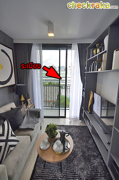 ห้องรับแขกก็มีระเบียงเช่นกัน แต่ไม่สามารถทะลุถึงกันได้เหมือน Type แบบ 58.07 ตร.ม. ค่ะ