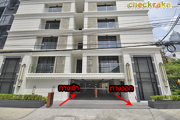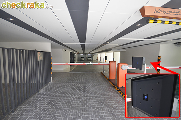 ทางเข้า-ออก ไปลานจอดรถใต้อาคาร มีป้อมรักษาความปลอดภัยอยู่ด้านหน้า